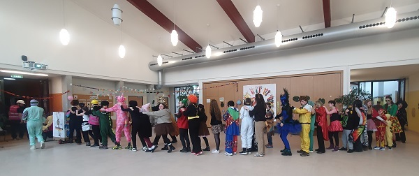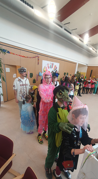 | Mit einer Polonaise liefen wir in die Aula. Ein toller Umzug voll mit Superhelden, Tieren und lustigen Figuren. | ![]() |